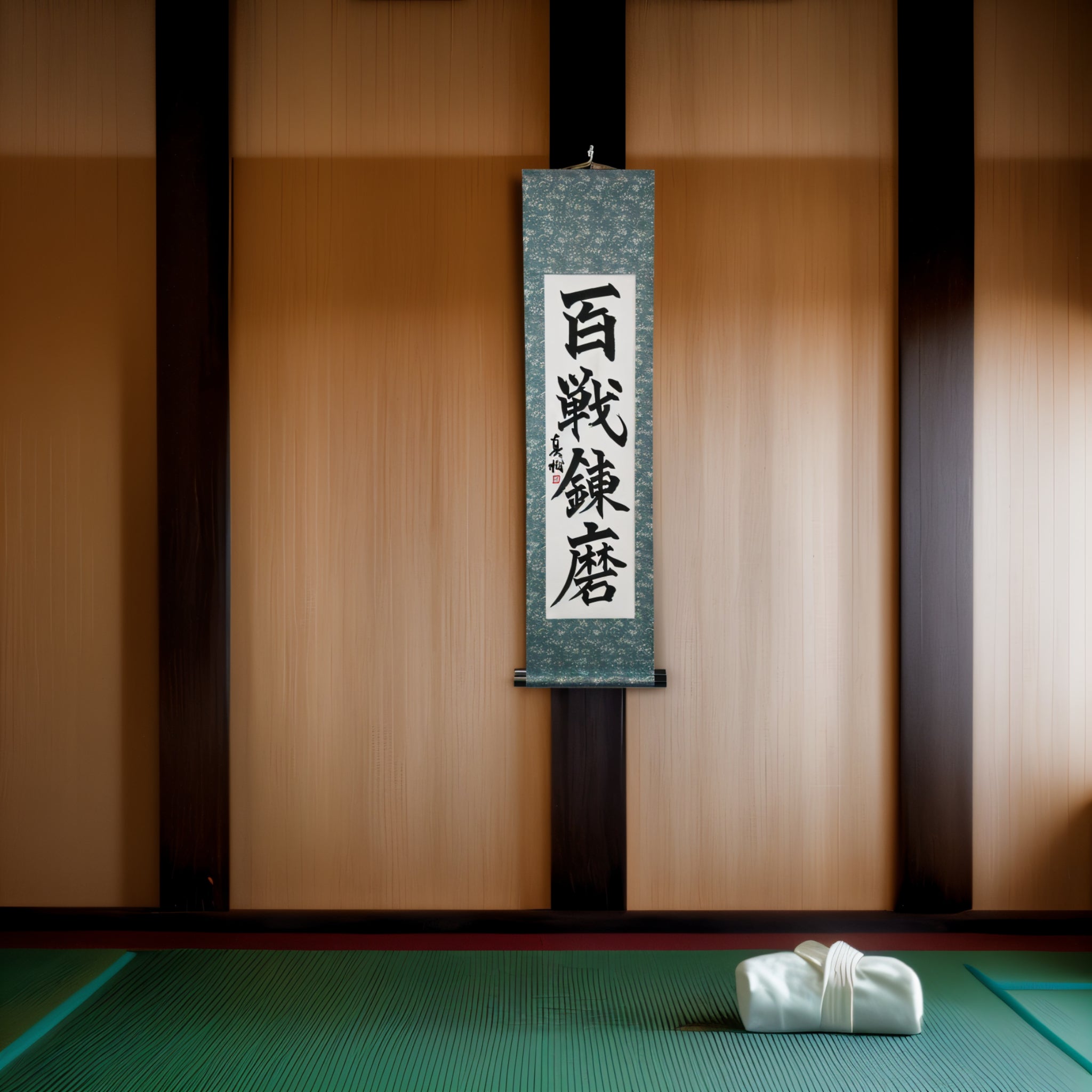 Honor a timeless Japanese saying with this dynamic calligraphy scroll featuring 百戦錬磨 (Hyakusen Renma) — a powerful expression that embodies the samurai spirit of strength, resilience, and mastery gained through enduring countless challenges.