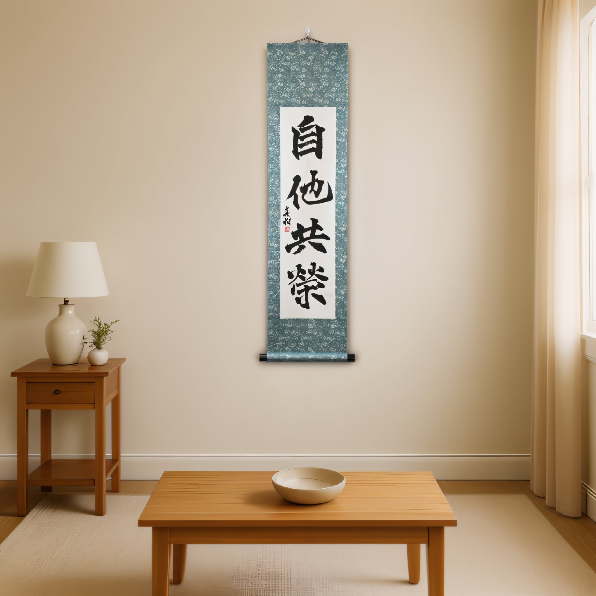 This Japanese calligraphy scroll features the timeless phrase 自他共栄 (Jita-Kyōei) — translated as "Mutual Welfare and Benefit". It is one of the two core principles of Judo, alongside 精力善用 (Seiryoku-Zenyō, "Maximum Efficient Use of Energy"), both established by Judo’s founder, Jigoro Kano (嘉納治五郎).