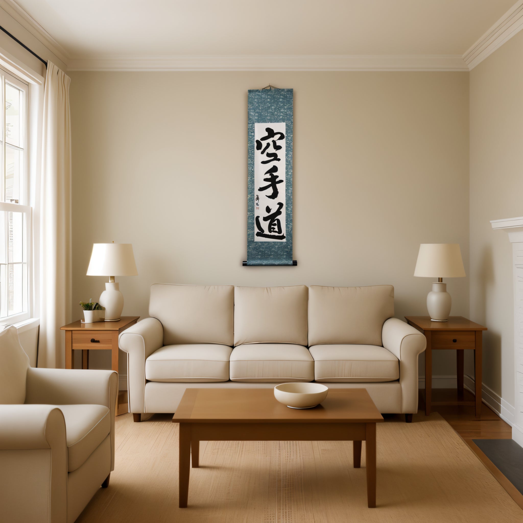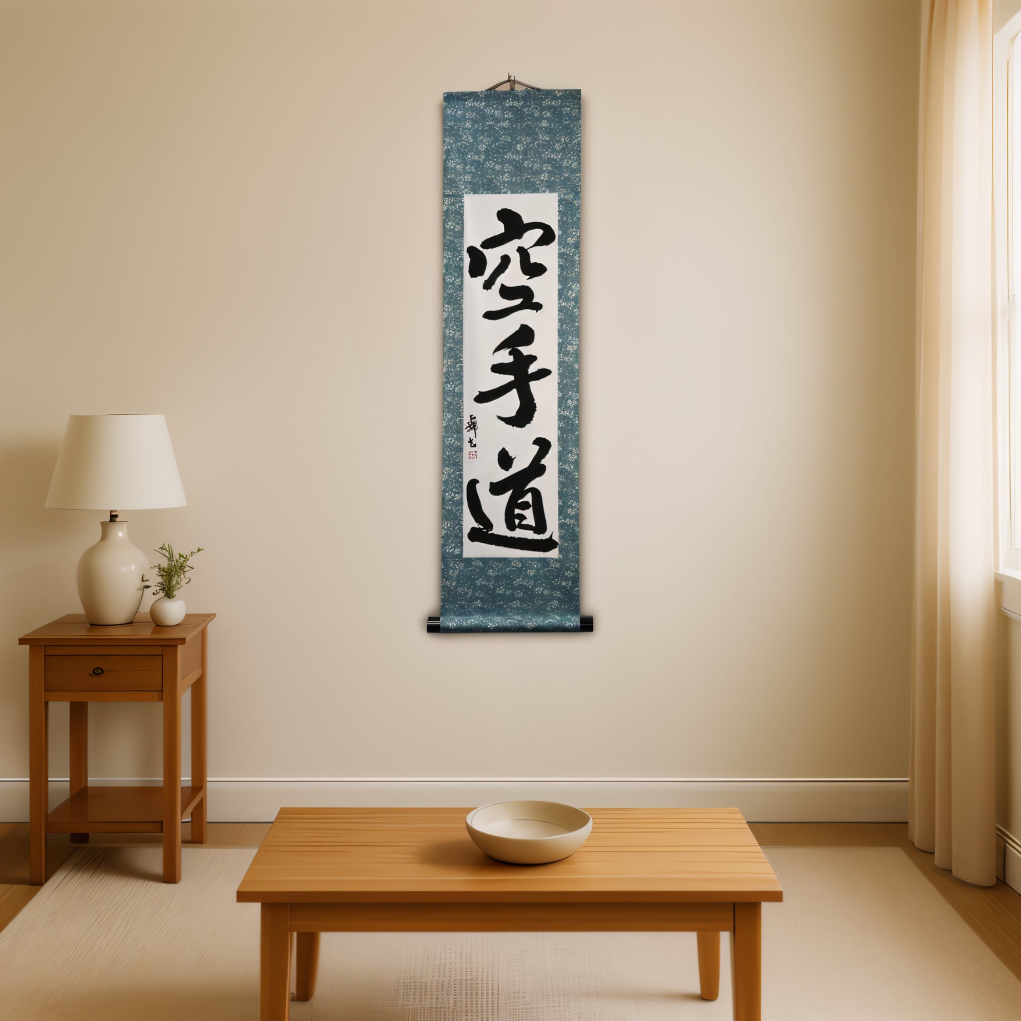 This calligraphy scroll features the powerful phrase 空手道 (Karate-do) — not merely a martial art, but a lifelong journey of discipline, respect, and inner strength.