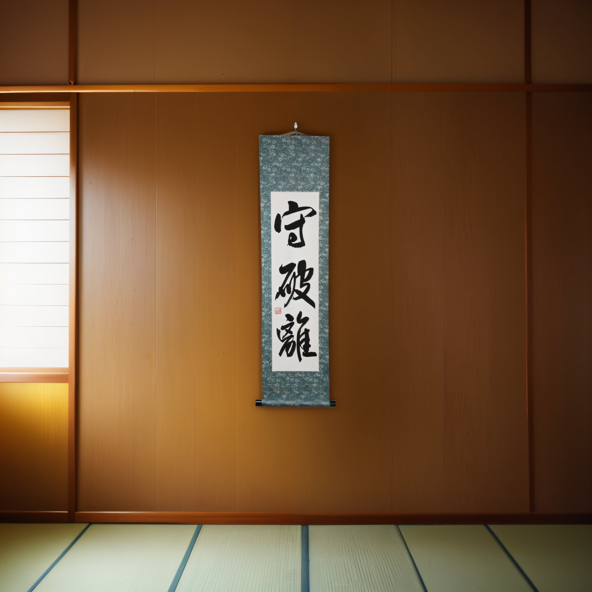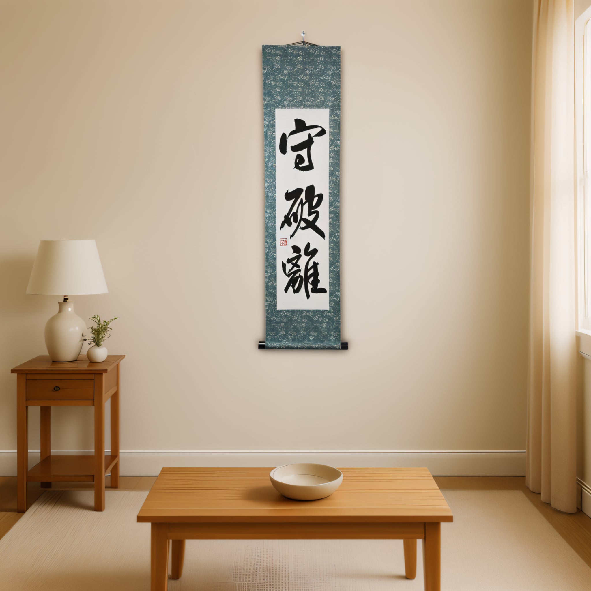 This Japanese calligraphy scroll features the timeless phrase 守破離 (Shuhari) — a profound teaching that captures the path of growth and mastery in all martial arts.